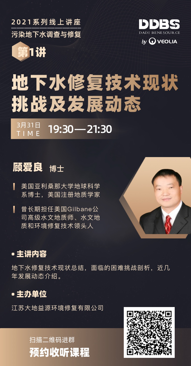 2021年“DDBS在線系列講座”第一講,將邀請顧愛良博士帶來《地下水修復(fù)技術(shù)現(xiàn)狀、挑戰(zhàn)及發(fā)展動態(tài)》主題課程。