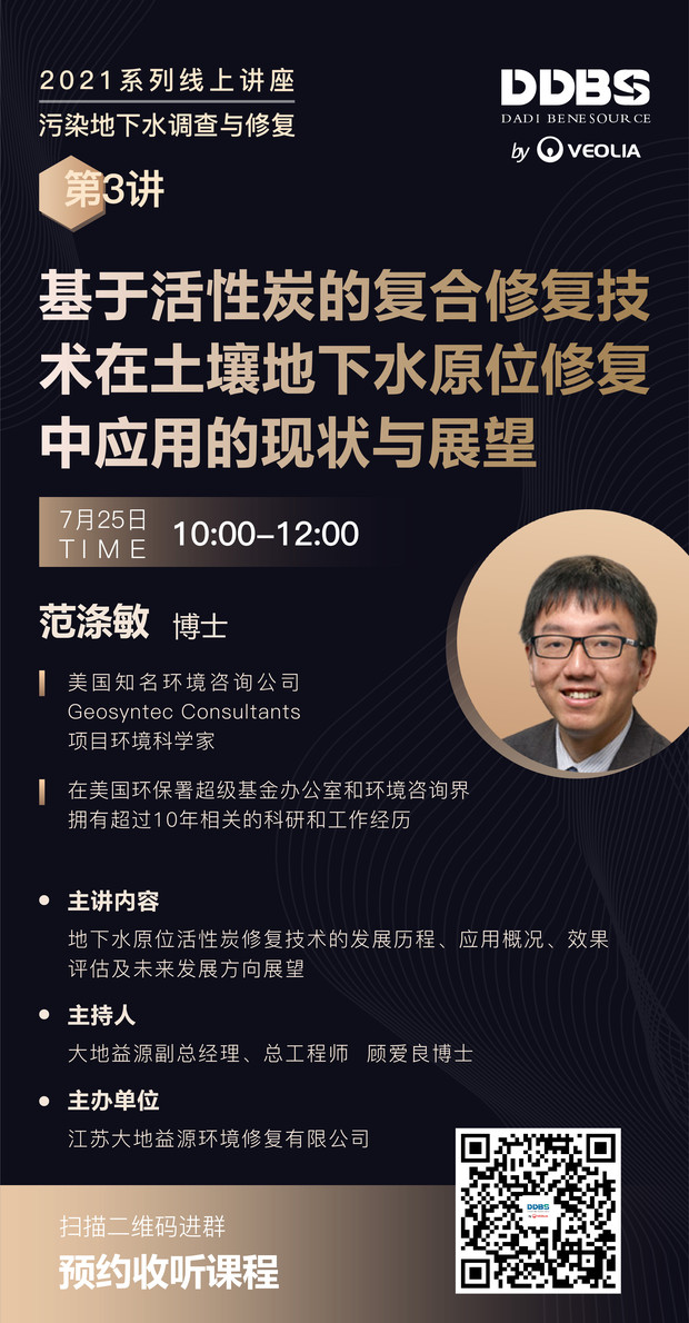 DDBS第三講將于7月25日(本周日)上午10點開講。講座特邀請范滌敏博士為大家?guī)黻P(guān)于《基于活性炭的復(fù)合修復(fù)技術(shù)在土壤地下水原位修復(fù)中應(yīng)用的現(xiàn)狀與展望》。