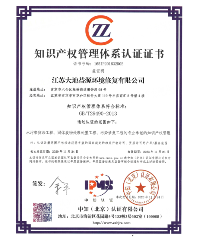 11月24日,江蘇大地益源環(huán)境修復(fù)有限公司正式獲得《知識產(chǎn)權(quán)管理體系認證證書》,認證范圍包括水污染防治工程、固體廢物處理處置工程、污染修復(fù)工程的專業(yè)承包的知識產(chǎn)權(quán)管理。大地益源從今年上半年啟動認證工作...